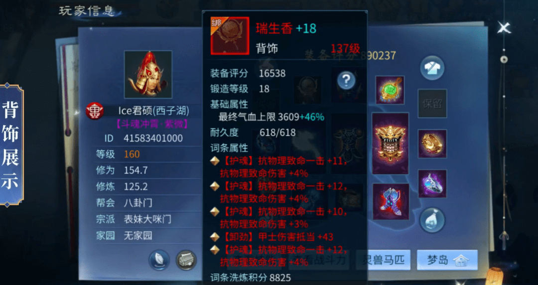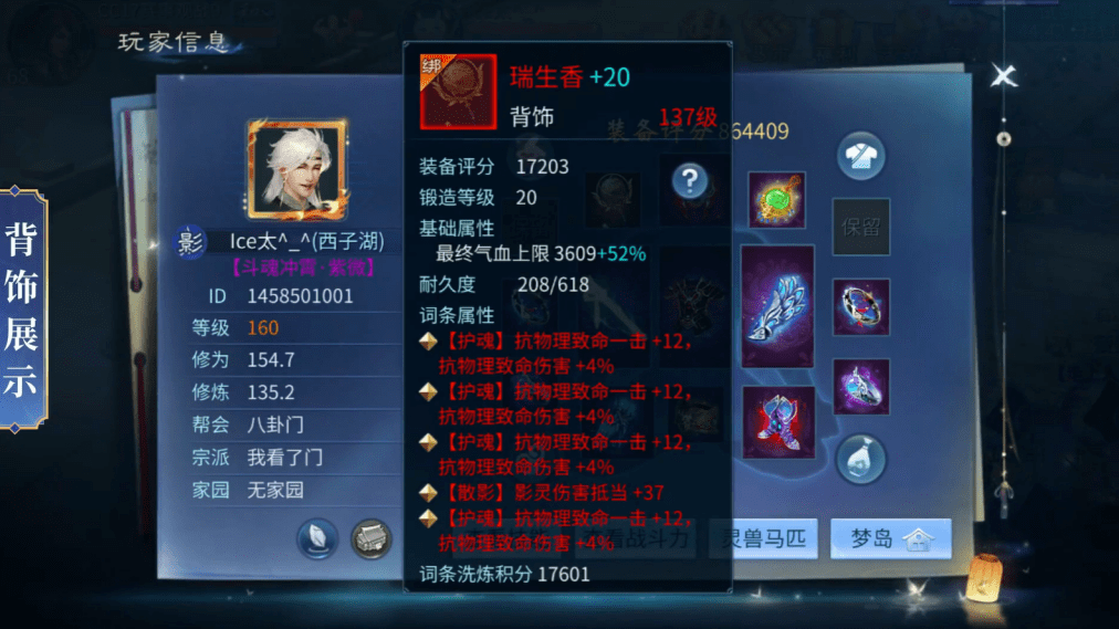 大家可以去看看我们每一个参赛号,这10个号应该涵盖到现在倩女所有的背饰种类了。比如这个 影灵背饰, 抗暴装评比较高,碰到影灵不需要用到忽视的时候,带个抗暴可能收益会更大一点。
