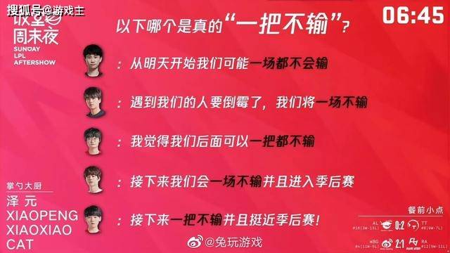 随后的饭堂节目还出现了之后的比赛,我一把都不会输。紧接着,Doinb,LWX,小天,刘青松和JKL的名言就出现在了屏幕上,他们几个人都说过一场是不输这句,但是接下来的比赛都非常的意外,尤其是阿水,在说了这句话之后,直接拿到了一个五连败,差一点连lpl赛区的季后赛都无法进入了。难道说这句话真的有魔力吗?毕竟之前do in b说的时候,也是以全败的成绩被淘汰了,所有的玩家都没想到,当时的fp x战队连北美的队伍都打不过。