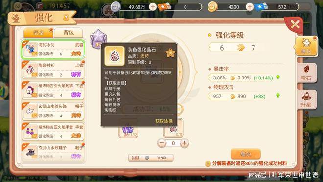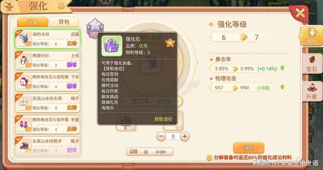 装备强化在彩虹岛手游里也是提升战力的主要手段之一,主要用到的材料是强化石。