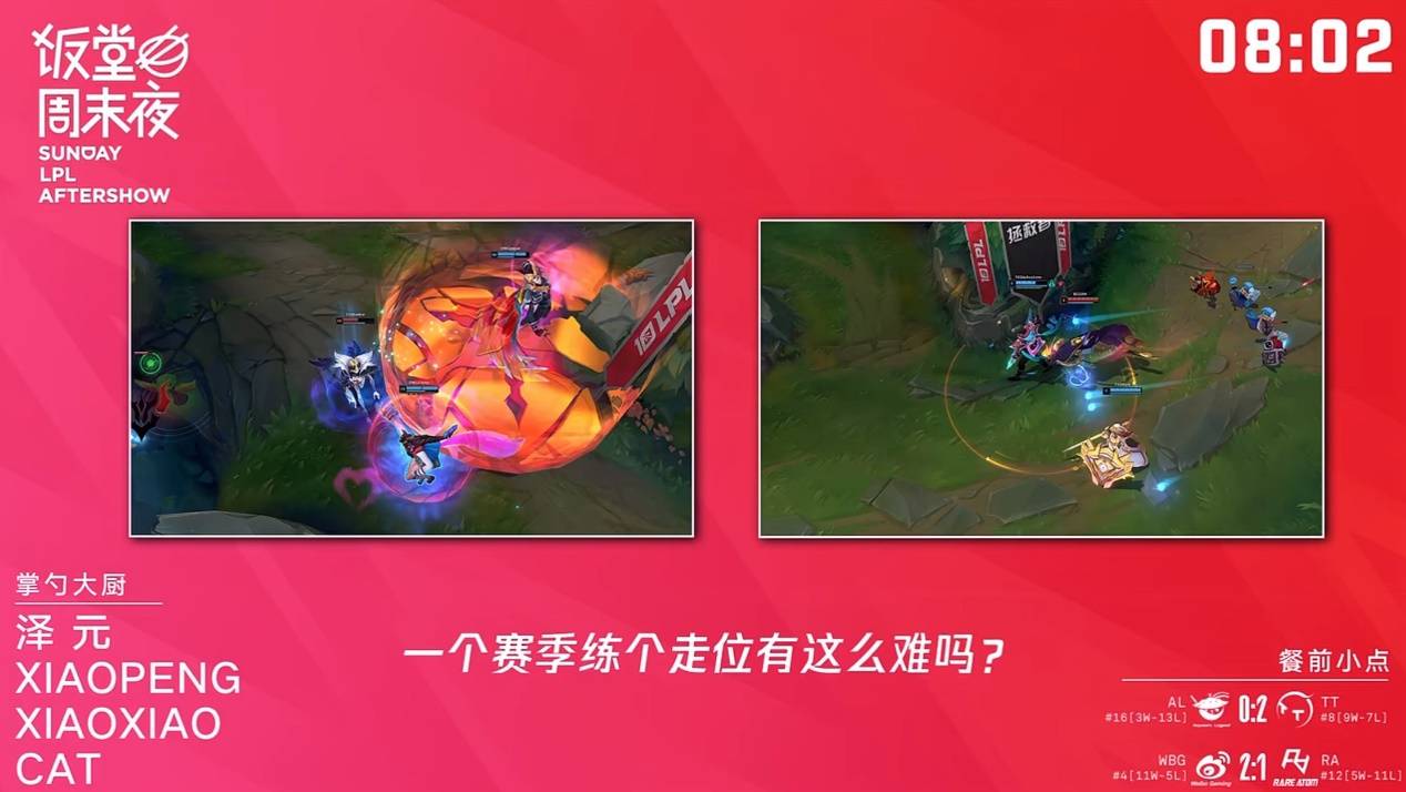 LPL春季赛常规赛阶段的比赛在昨天全部结束了,结束之后还安排了一期饭堂节目,请到了管泽元,Cat,笑笑还有小鹏(两位TES名宿),开始火力全开。