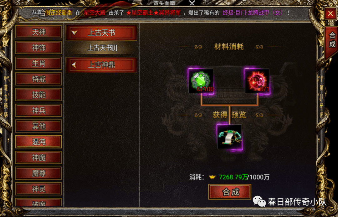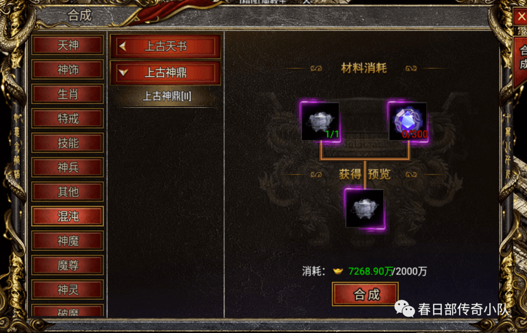 接下来说一说上古神鼎,上古神鼎是由神鼎碎片加上万能合成是进行合成的,其中的神鼎碎片我们可以在声望商城以及运营活动中获得哦!