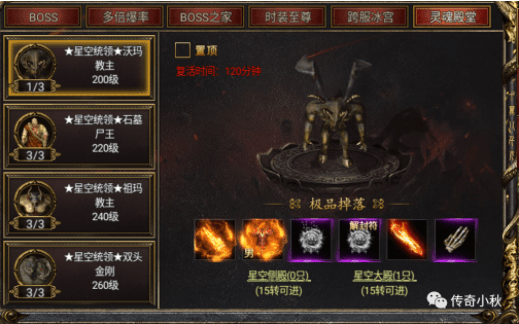 大家好我是传奇小秋。黑暗光年(同款游戏白蛇传奇、王者光辉、天战传奇、西游传奇、剑舞龙城、域极天下、苍穹灭、一剑屠龙、斗战国)三端互通折扣平台手游中灵魂殿堂开启时间进入条件攻略(新区1320上地仙、包服。关注公主号‘传奇小秋’)