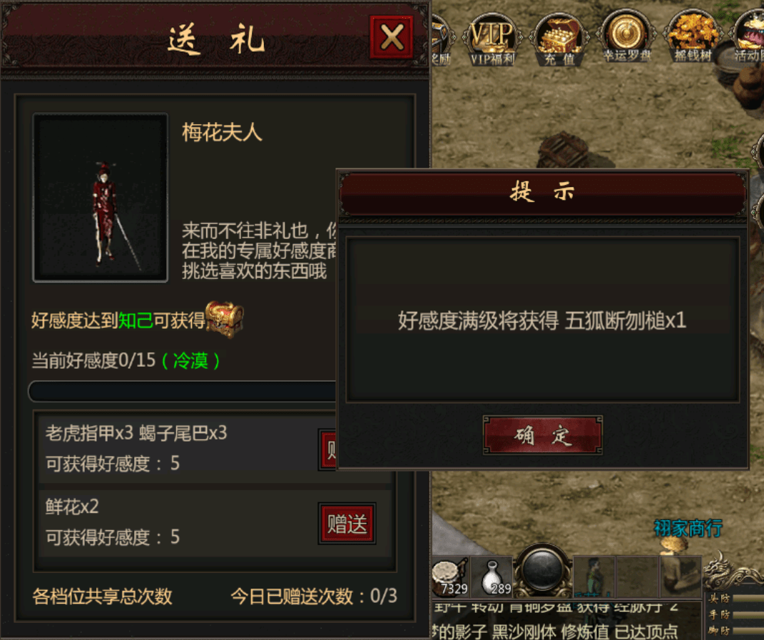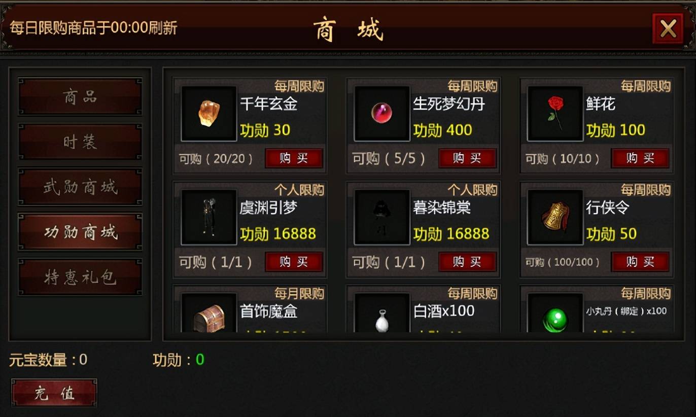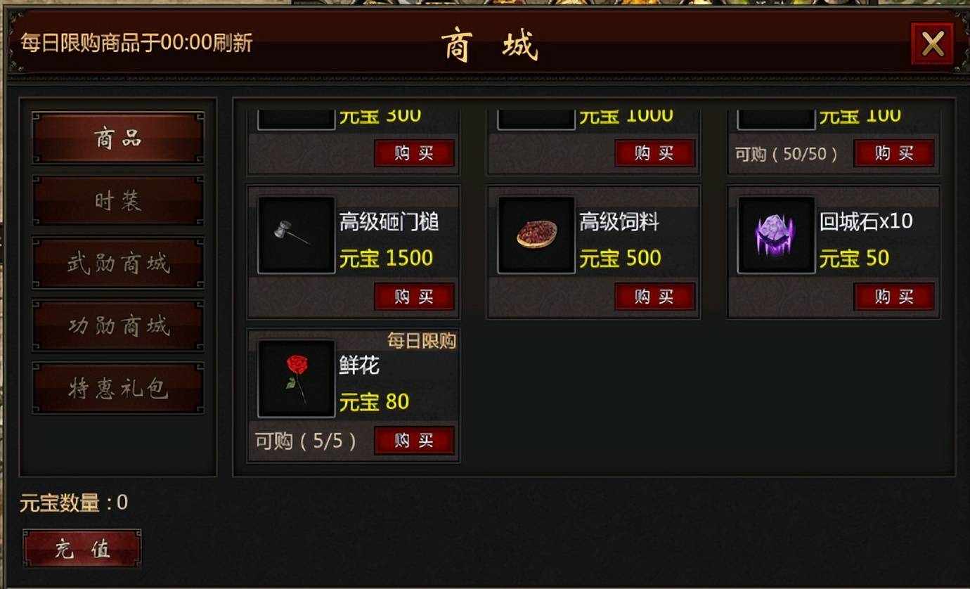 下面就是氪金大佬的玩法了,零氪党就不要看了,先说一下鲜花在商城的售价为80元宝,每天可购买5个,功勋商城中每周可兑换10个,每次需100功勋,功勋的获得方式是参加门派战。