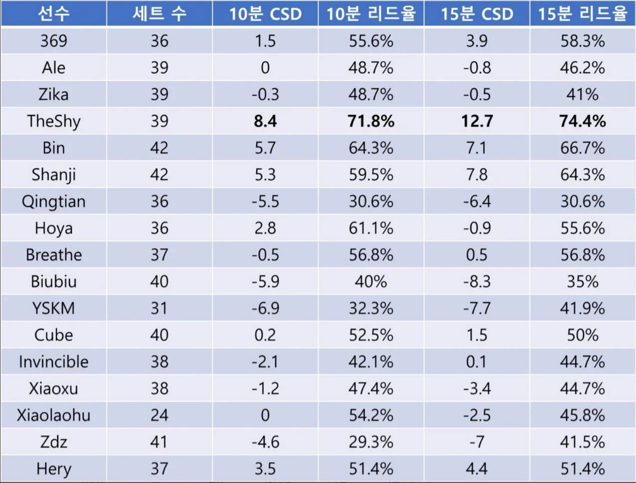 The Shy之下,排名是Bin,Shanji和Hery,Hoya也还不错,从这个数据来看,对线基本功强同时以对线压制为核心打法的选手基本就是这几个了。