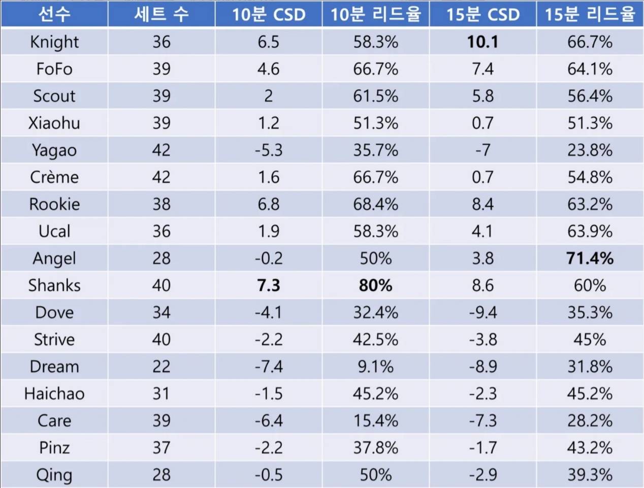 韩网给出了上单,中路和下路选手在10分钟,15分钟的补刀领先数据以及10分钟,15分钟的领先率数据。