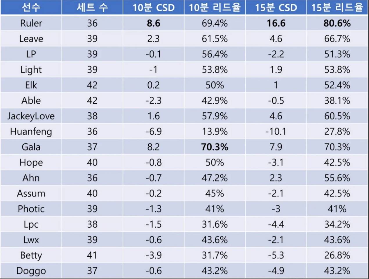 GALA是最让人意外的,10分钟领先率比Ruler还要更高,但到了15分钟有所下滑,这个数据和战队实力相关。