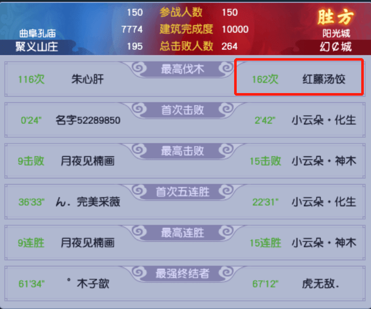四连冠的背后,是【幻¢城】对跨服联赛的深刻理解和对细节的认真把控。对于【幻¢城】来说,存活率是跨服联赛的第一要素,每个参赛成员都应该尽可能的保证自己的存活率。因为,高存活率就代表着对手在【幻¢城】手中拿不到足够的击败人数,在剩余人数上永远占不到优势。