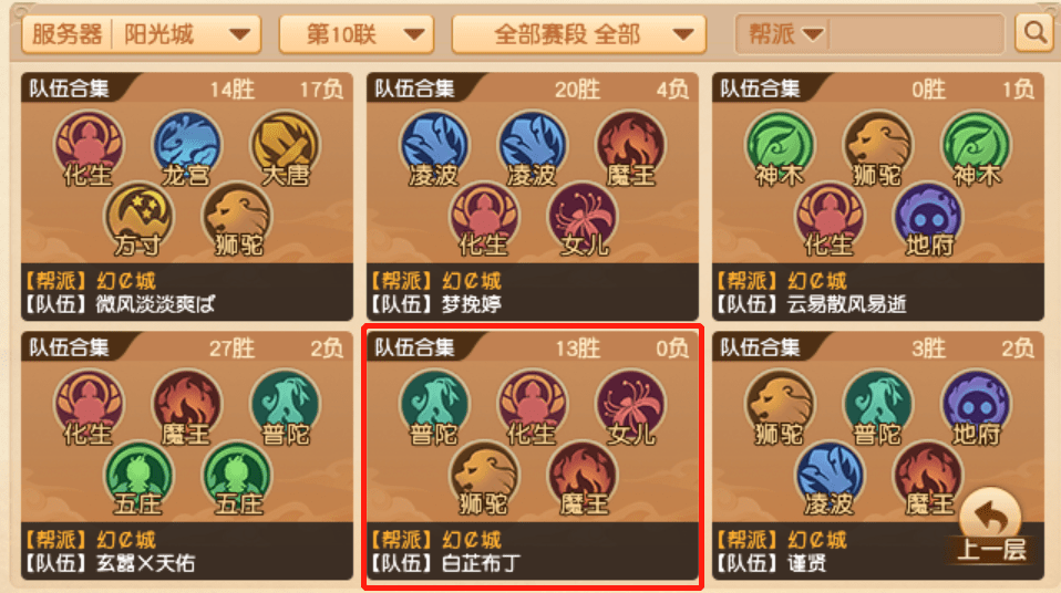 从最近三联(第七联、2022年度总决赛、第十联)来看,白芷布丁的队伍一直保持着双辅助(化生+普陀)+女儿+双攻(前两联是双法,第十联换成了狮驼+魔王)。可以说,白芷布丁的阵容核心就是双辅助搭配女儿。