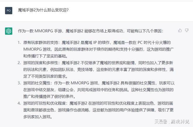 相比之下,同样的问题,两大人工智能语言模型给出的答案出入会比较大,文心一言相对来说基于公开的一些信息,更多着眼于魔域手游2的一些特点。而chatGPT会深入评判一款网游包括玩家群体、游戏的深度和多样性、社交属性、和可玩性等多个角度,相对来说分析的会更加全面一些。