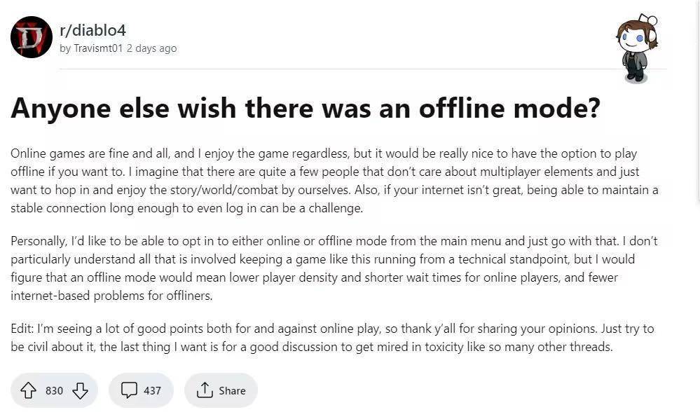 许多暗黑粉丝已经厌倦了《暗黑破坏神4》必须全程联网的要求,他们呼吁开发者加入离线模式,让玩家可以离线玩游戏。因为暗黑服务器不给力,让玩家不得不面对漫长排队和频繁断线问题。