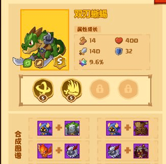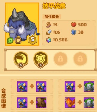首先就是给大家分享一下小编现在白嫖到的s级战宠-皮夹战象。在咱们成功合成战宠之后,图鉴上能够显示出它的合成图谱,也能显示其所用的技能。这明显是一个前排战宠,能够为咱们提供很高的坦度。如果你是攻击流派如暴击、连击一类。就可以选择这种前排战宠为你抵挡伤害,从而有更多的输出机会。前排的等级一定得高,因为战宠的全忽视属性是跟着等级的提升而提升的。如果忽视不够高,那么你的战宠也仅仅是给你的外表加了一层铁皮罢了。而你将面临的是对方的前排(或后排)与英雄的混合双打。所以宠物的等级是非常重要的。