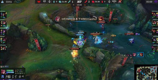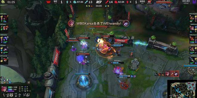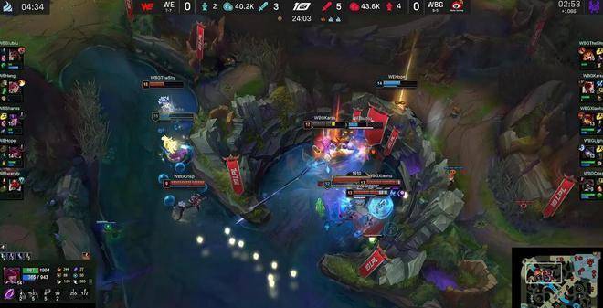 25分钟,WBG虽然依靠中野的先手和凯南的进场率先融化掉WE双人组,但残局再也无法处理WE的上中野了,被WE打出2换5的完胜拔掉中路高地。