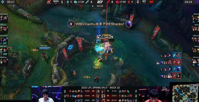但WE控先锋时却大意了,盲僧抗先锋到残血,蔚抓到机会直接一套收下盲僧人头,还顺手接盘先锋,10分钟,Biubiu对位单杀Theshy,下半区龙坑同时开打,小虎狐狸打出精彩的传接球,两段Q都是刮到了多人,在龙坑内完成精彩的三杀,帮助队伍在3打4的情况下完成2换4的完胜!