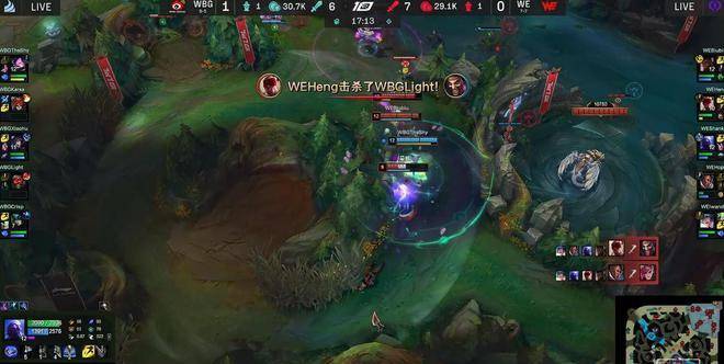 WBG不得已启用PlanB,将先锋喂给了鳄鱼,但WE双人组的换线配合奥恩远距离开团击杀了Theshy,反而是厄斐琉斯吃到了上路一血塔,WE前期节奏相当不错。