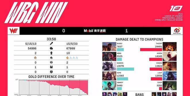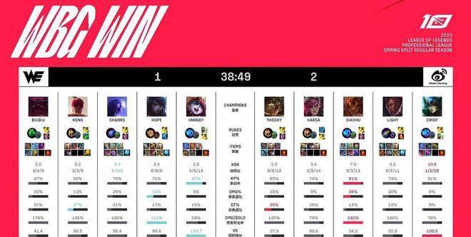 #2023LPL无畏竞巅峰#2023年3月21日,LPL春季赛第十周第二个比赛日,WE对阵WBG。赛前WBG以9胜5负的战绩位列第四,但想要保住前四的成绩依然是不容有失。WE则是在争夺季后赛门票的关键期,7胜7负的战绩暂时位列第九。