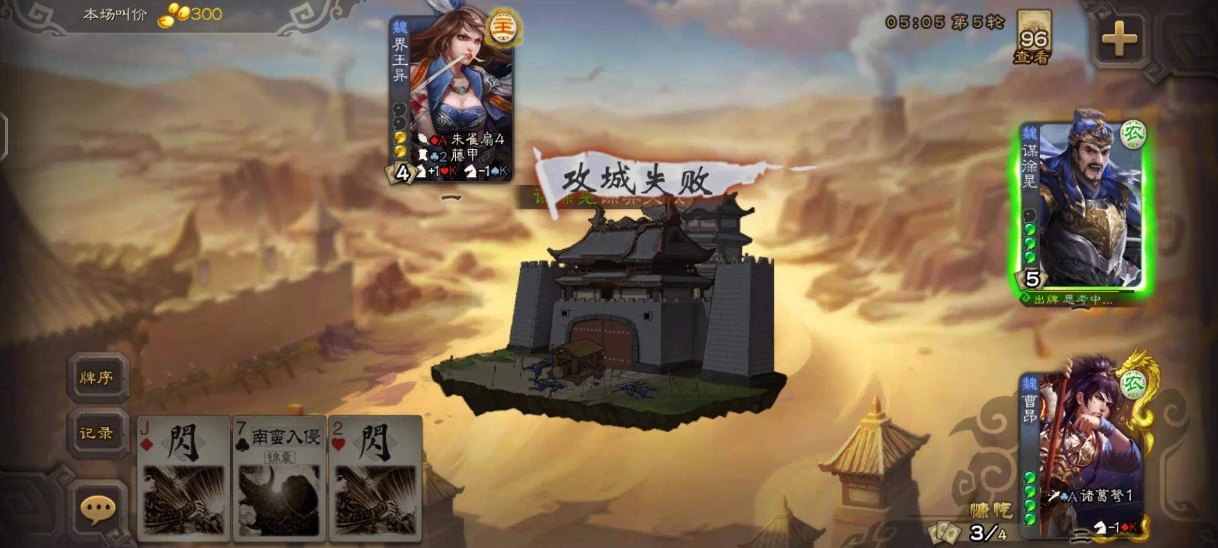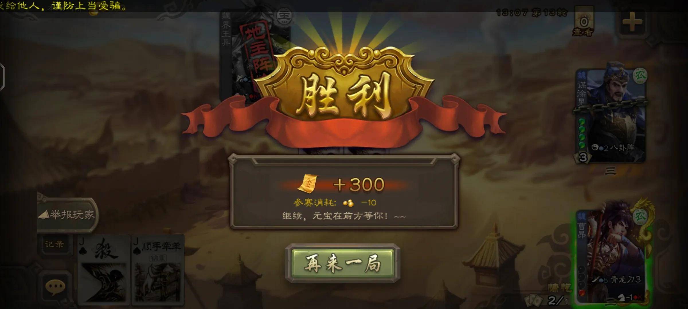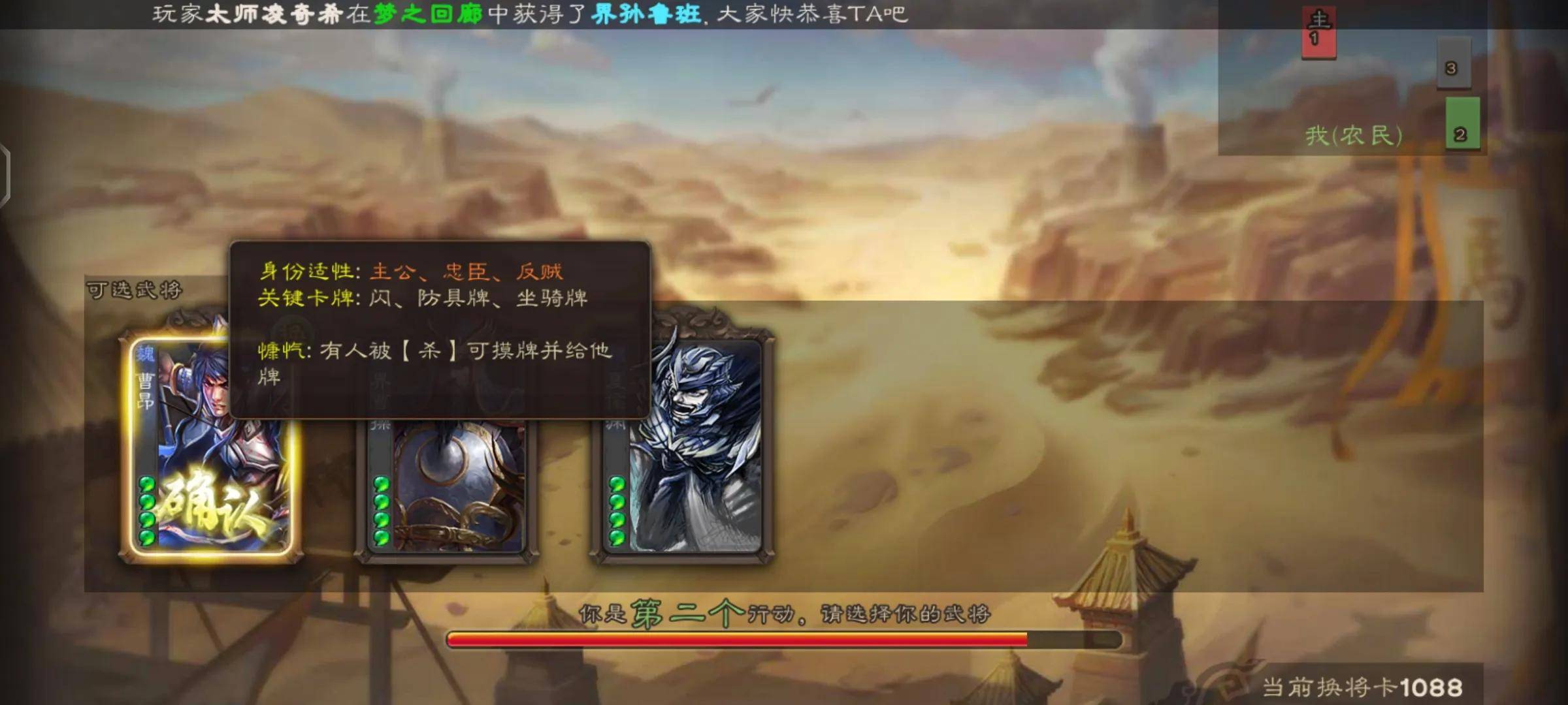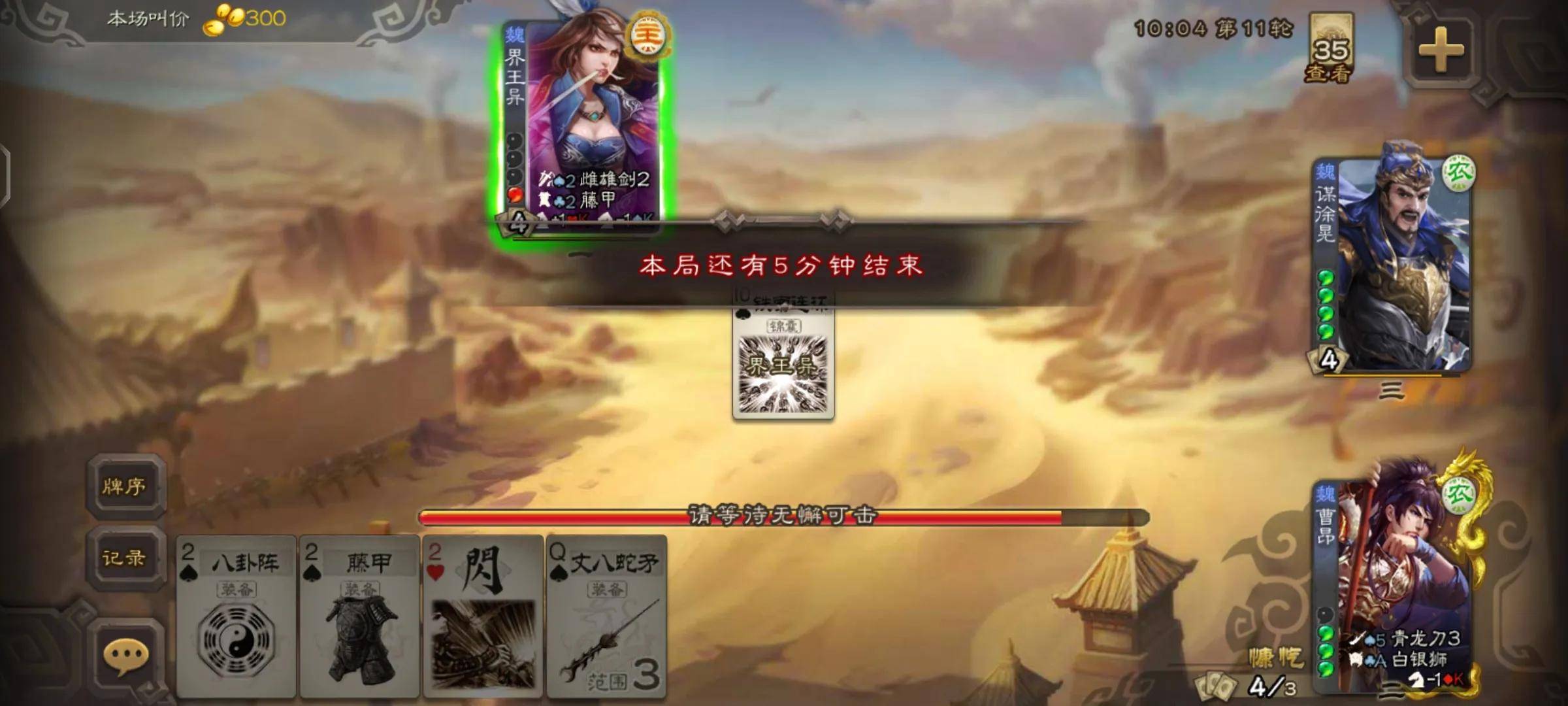 所以我们在开局时,如果对方直接丝毫不考虑叫了三倍,我们拿曹昂碰到界徐盛和白马的概率是非常高的。