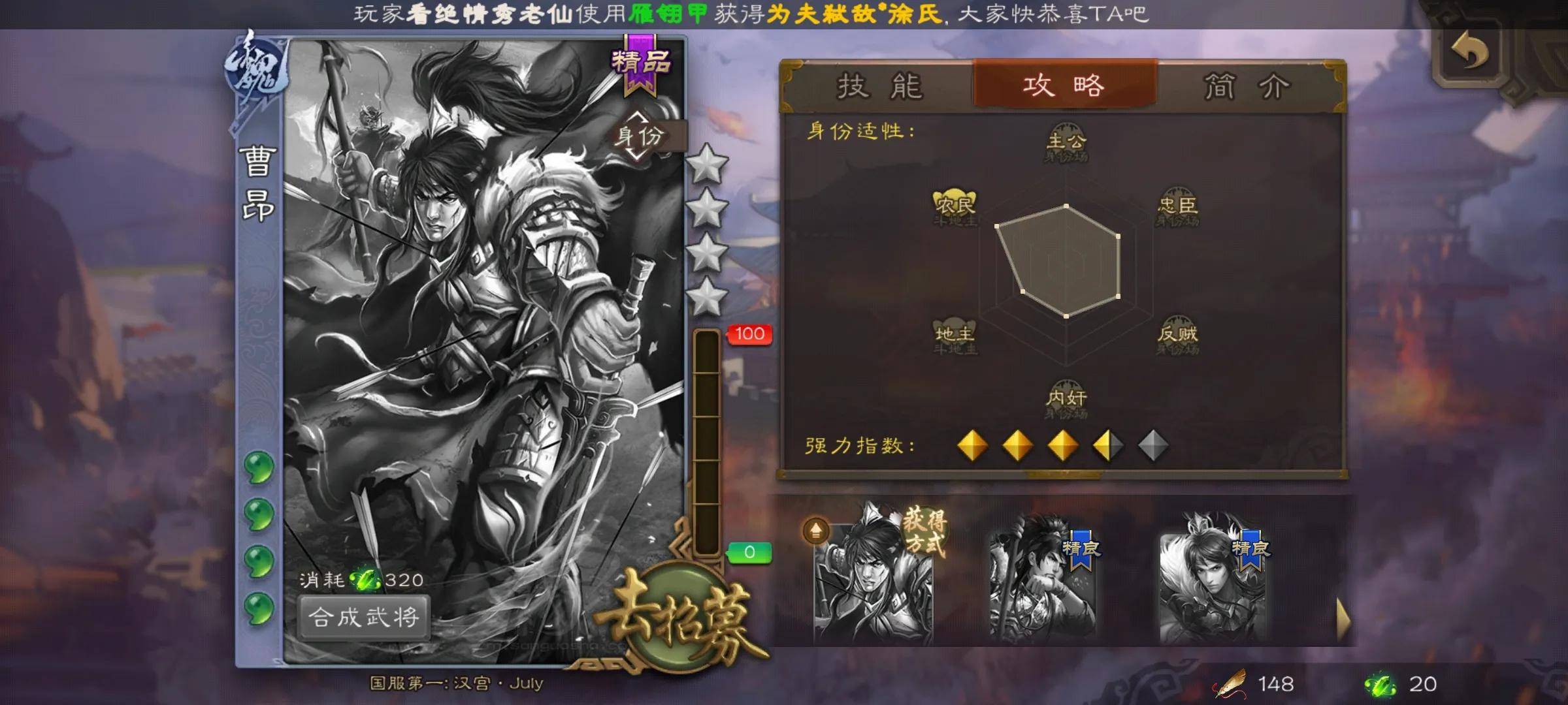 目前合成曹昂这个武将只需要320个将魂,还算是比较便宜的,性价比也比较高。