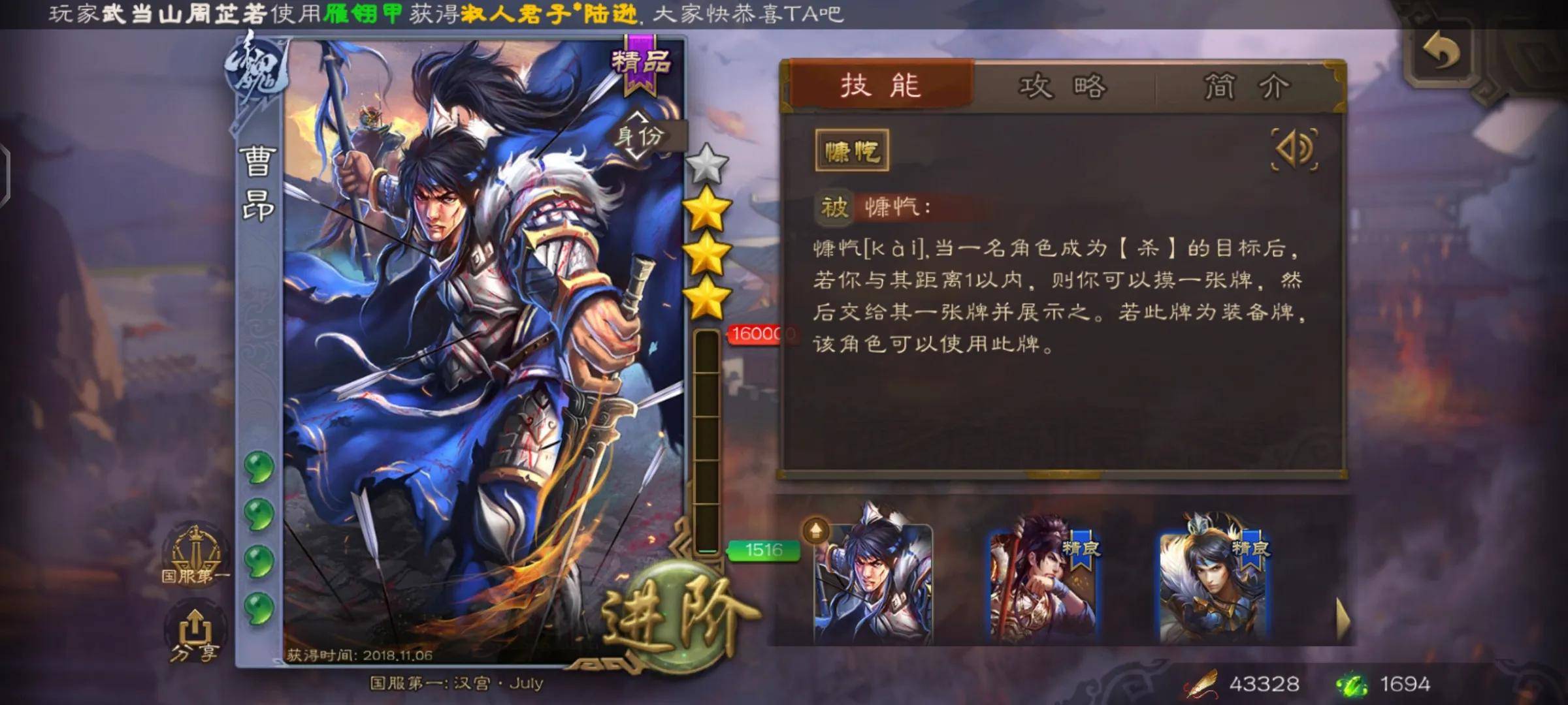 上面分析了曹昂的强度,主要是针对于那些攻击力较强,过牌量较小的地主,比如威名赫赫的界徐盛。