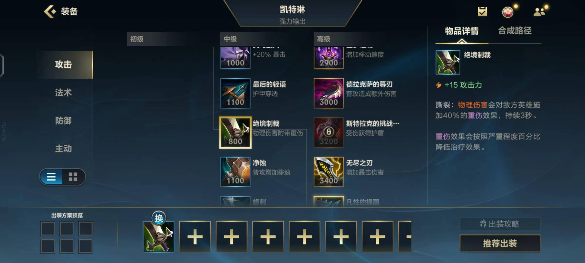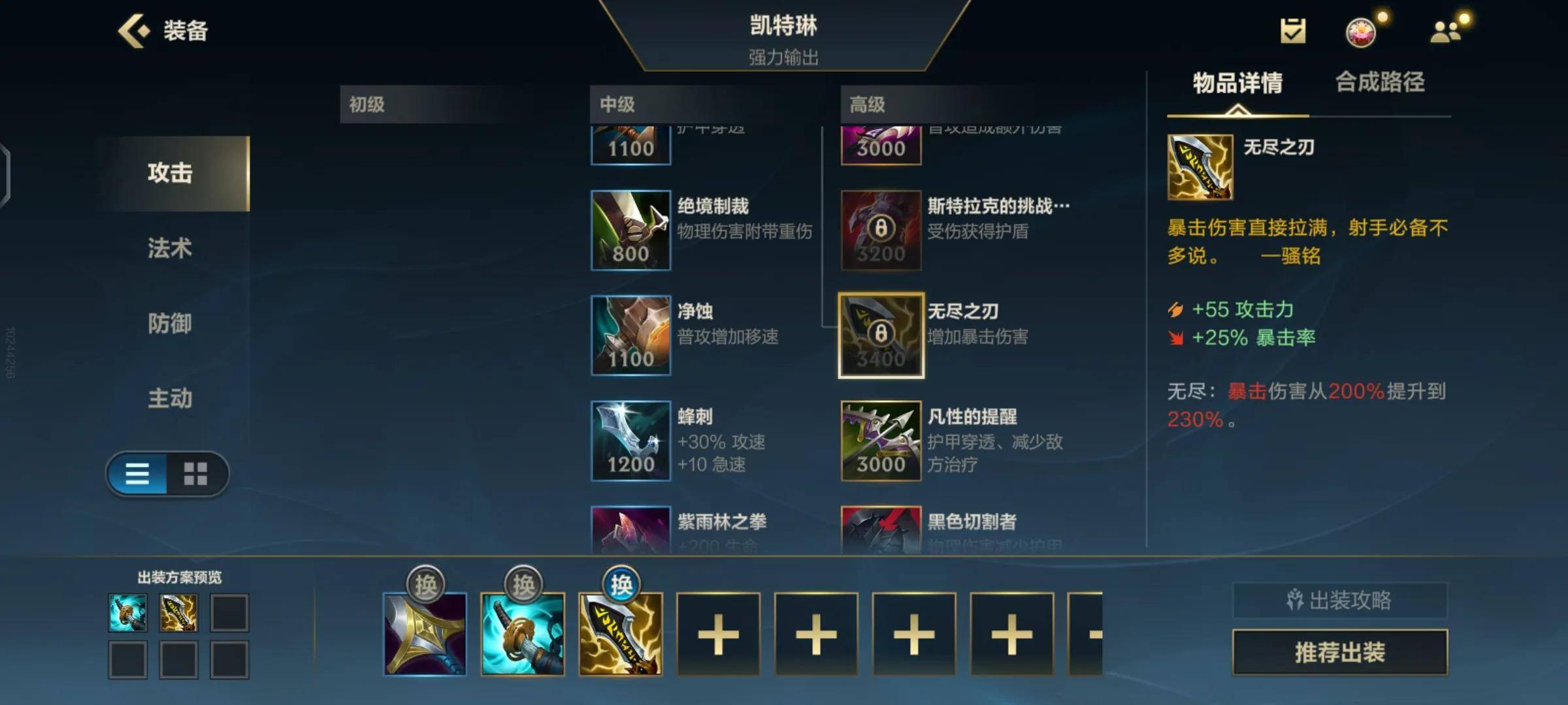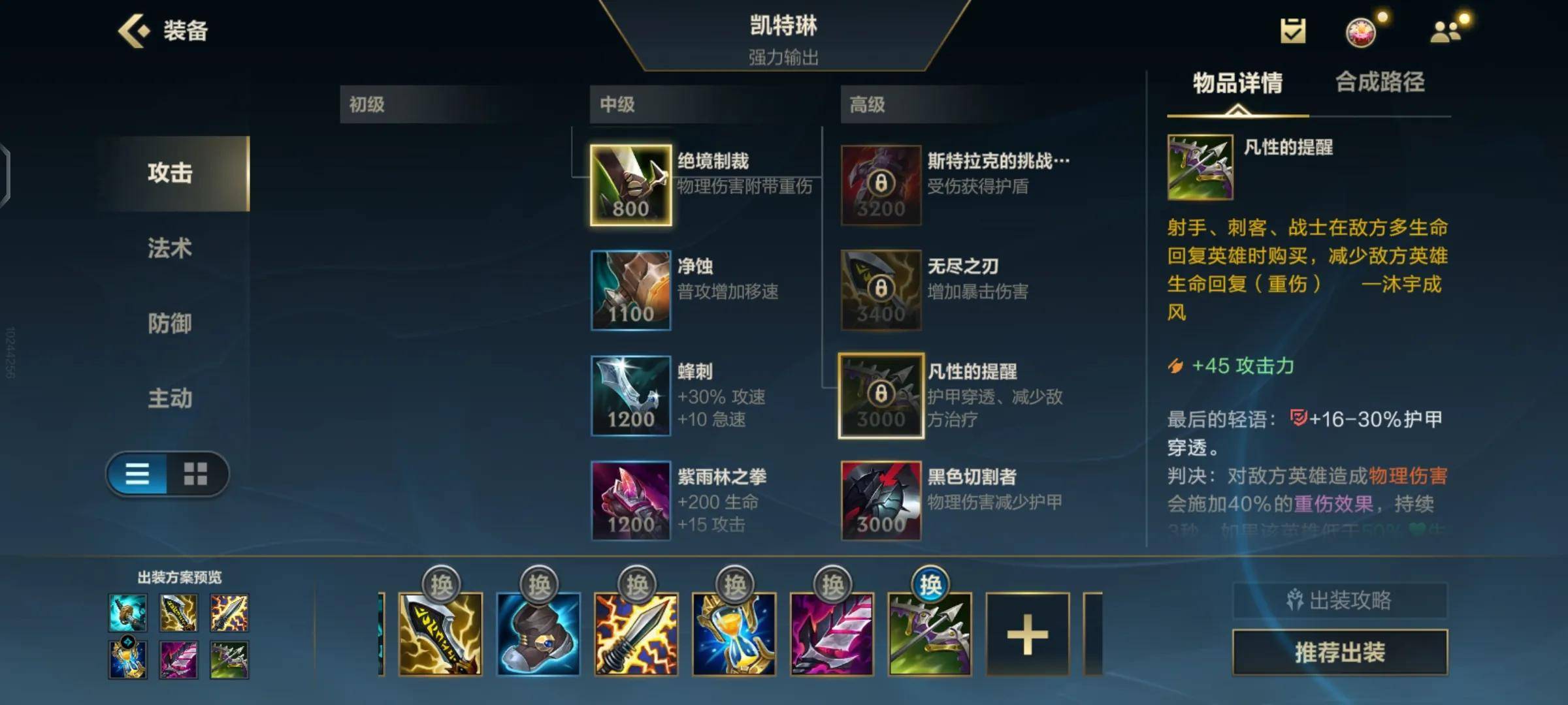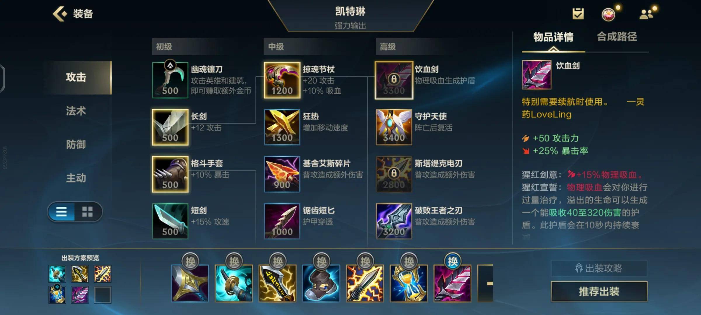 再往后就是一个吸血刀来提高我们的续航,当然了,如果对方阵容高回复或者说阵容比较弱的话,我们可以最后一件再出吸血,先拿穿透。