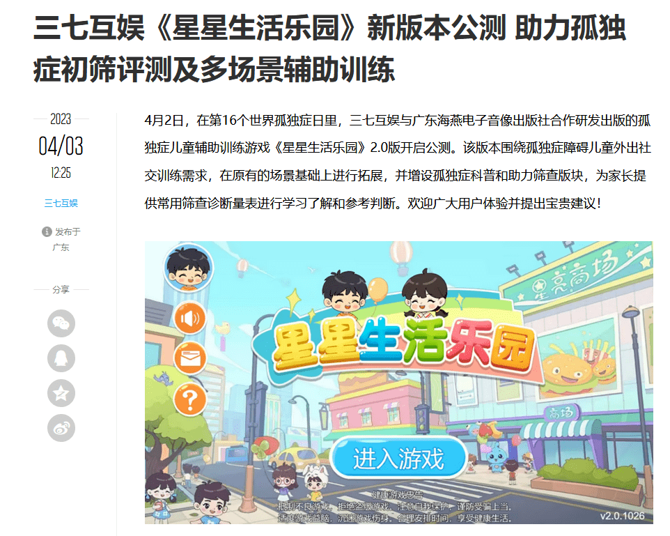 另一款为《星星生活乐园》。据广州日报新闻表示,《星星生活乐园》是由广州爱心企业、公益组织、高校教师以及心智障碍群体发展相关领域的专业人士共同打造的公益手游。不过,在此次获得版号前,早在2022年这款手游就已经对外推出,今年过审后其游戏新版本2.0版已于4月2日上线公测。
