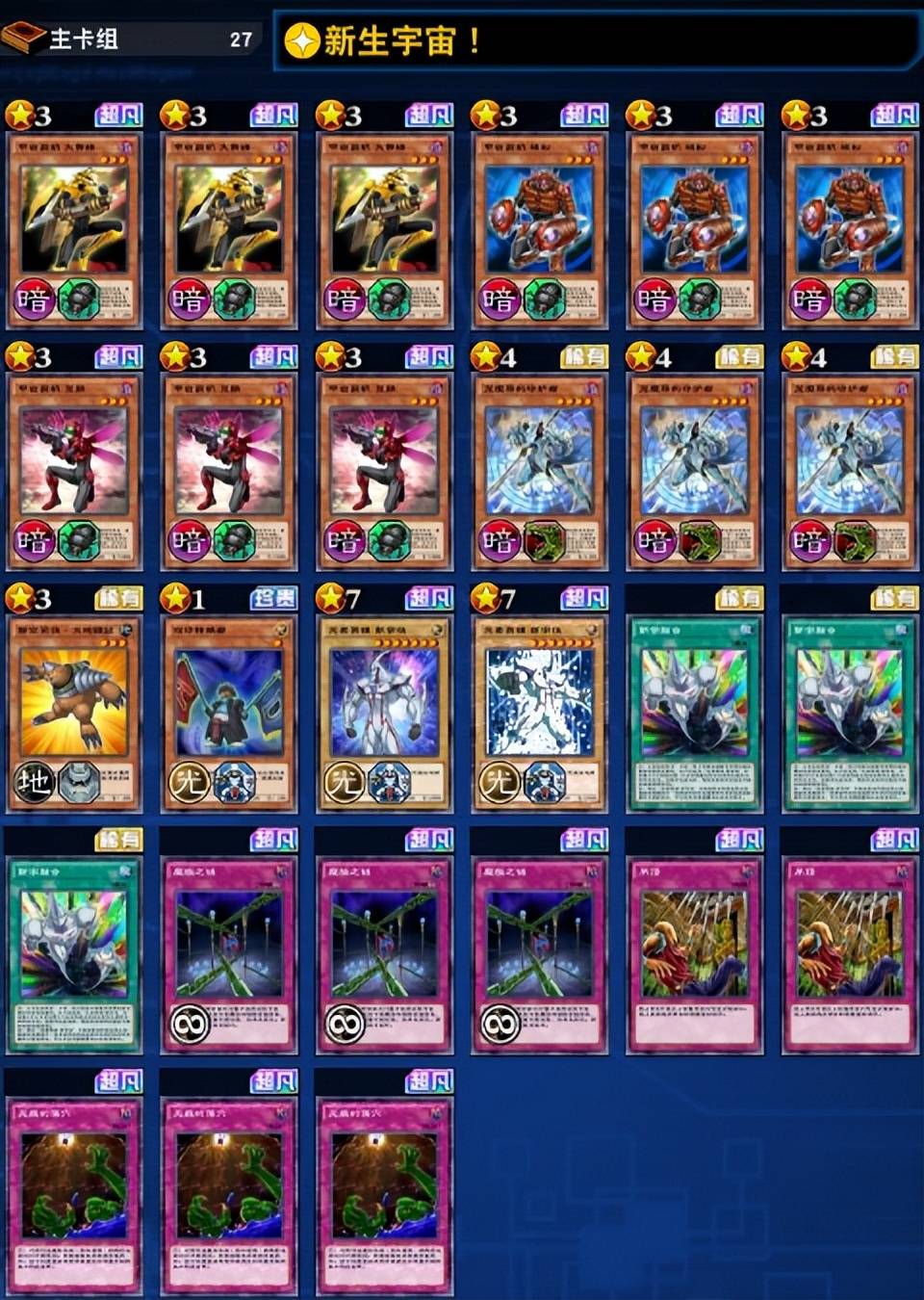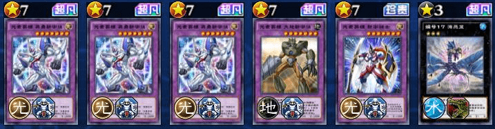 由于社群赛要求必须携带超量卡,所以最后卡位携带了一张海恶龙,大家可以根据情况替换成大地新宇侠即可(主轴可再添加一张大地鼹鼠)。