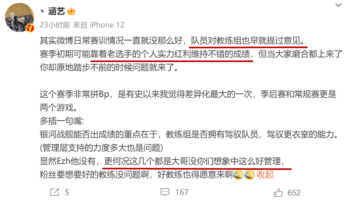 训练赛一般都是靠教练安排调整的,总不能全靠选手自己BP制定战术吧,那教练不就只剩下点外卖的作用了?而根据知名爆料人涵艺所说,WBG队员早就对教练组提出意见,赛季初只靠选手个人实力维持成绩,拖到后面原地踏步就要出问题,明显EZH没有能力管理这几位明星选手。