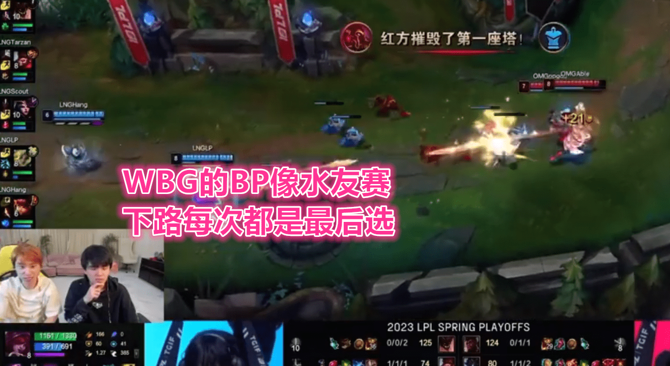 昨晚Doinb跟Lwx在直播间解说比赛,Doinb顺口提了一句:“WBG的BP像水友赛,每次都是四五楼才选下路,只剩下垃圾英雄打泽丽,AD辅助都很烂!”很少有队伍像WBG这样先抢中上野,下路又没准备什么新套路,感觉就是死套公式没得变通,但那套阵容在常规赛都玩了多少次了,其他队伍早就懂得怎么应付了。