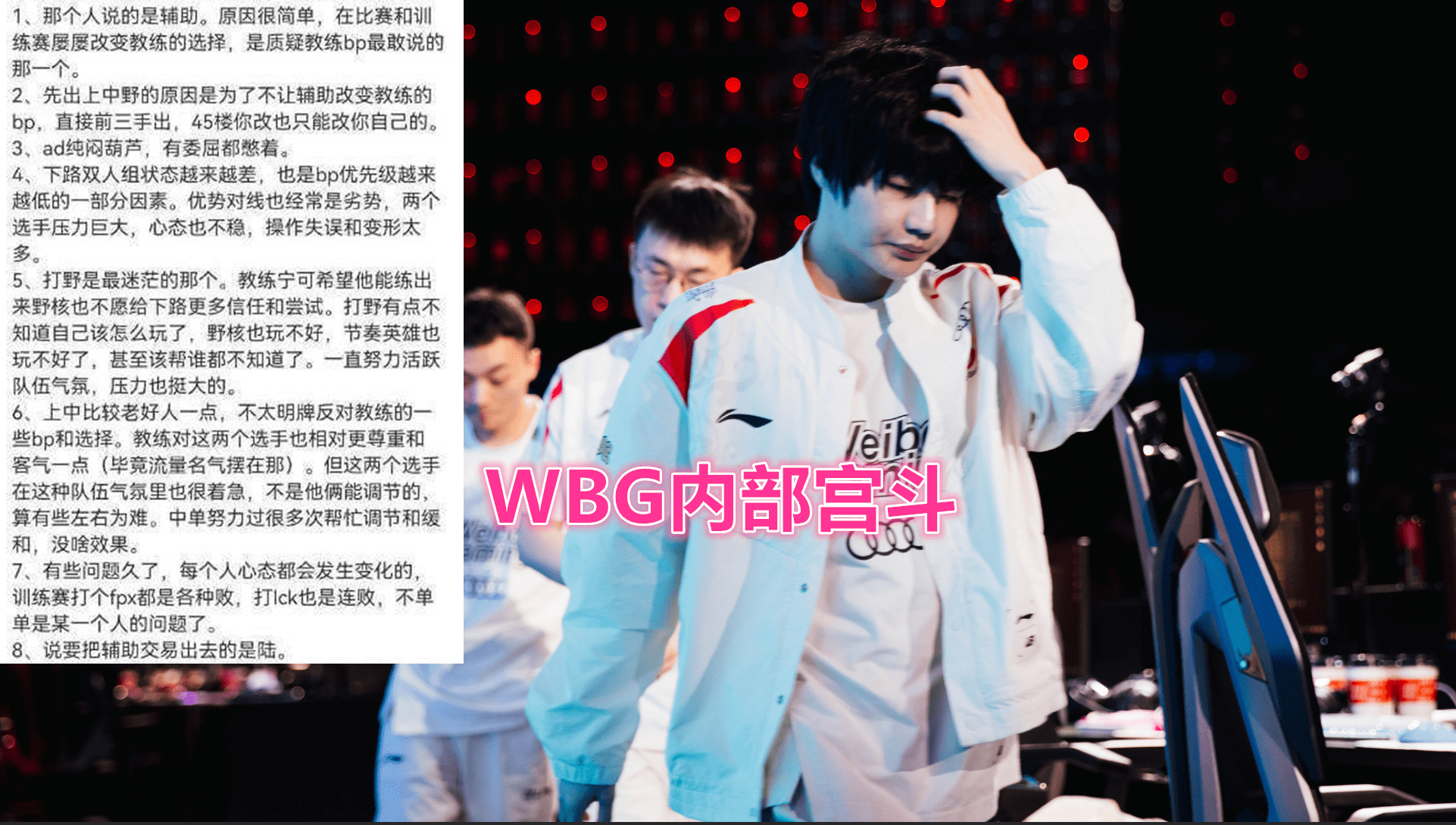 至于Doinb口中的那个人,有很多网友怀疑是辅助刘青松。随后网上开始流传宫斗爆料,据说刘青松经常在比赛和训练赛中改变教练选择,这回WBG先出中上野就是教练故意不让辅助改变队伍BP。EZH教练希望Karsa练出野核,不愿给下路更多投入,但卡萨练不会野核,连节奏英雄也忘记怎么玩了。