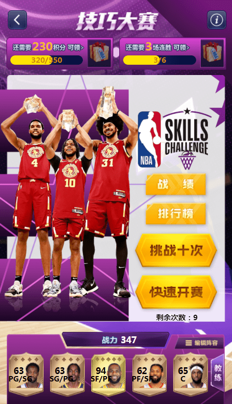 技巧大赛再度来袭!与真实的全明星技巧大赛相同,NBA英雄中的“技巧大赛”考验的也是各位玩家手中卡牌各方面的属性!各位玩家点击 活动中心——技巧大赛即可参与!