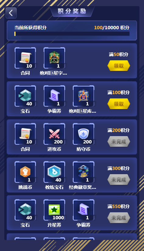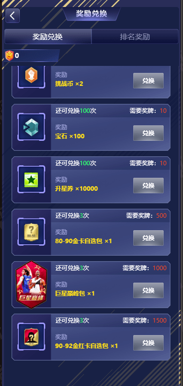 每次挑战传奇三巨头将根据球队的比赛数据评定相应积分,积分越高获得的奖状数量越多!奖状可在活动兑换页面换取各档金红卡自选包、巨星巅峰包、宝石、升星券等精彩好礼!