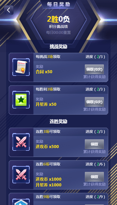 每日累计消耗 20000球探币即可获得潜力券*1000+50进攻经验书*5+进攻币*5000+防守币*5000;