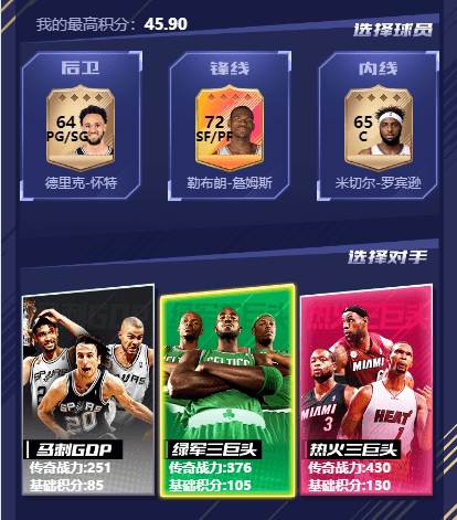 传奇3V3等你来挑战!选出你最强的三人组与3组传奇三巨头一决胜负吧!各位优秀的经理人可选择三名球员向马刺GDP、绿军三巨头、热火三巨头中任意一组传奇三巨头发起挑战!