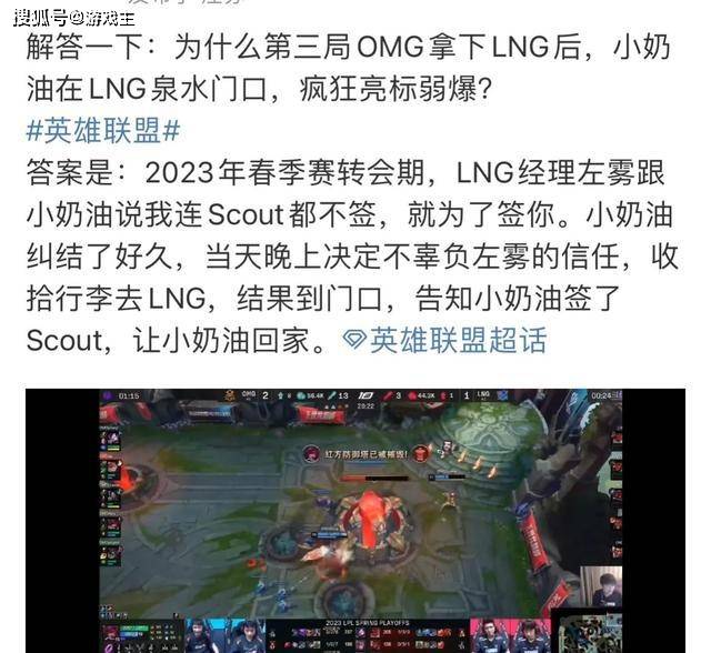 不熟悉的玩家可能不知道,在冬季转会期的时候,lng战队的经理表示要签约小奶油,甚至还直言scout都没有签。结果在小奶油打包好行李来到lng战队门前的时候,他们却转身和scout签约了,这个事情应该让小奶油非常的难受,这次的获胜也是让他出了一口恶气。在比赛获胜的瞬间,官方解说王多多也是再次作诗,雷公抖擞风云转,且看山鸡天雷闪。作为公认的高学历解说,他每一次的结束语都太精彩了。