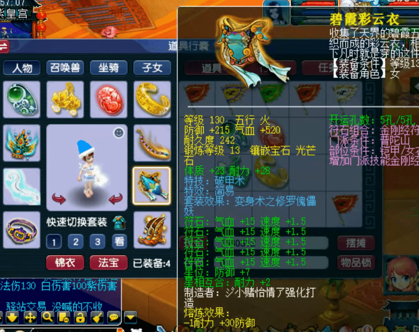 对于天科组的玩家来说,除了无级别限制之外,这种特技+简易+精致的装备绝对是最好的选择!因为130级简易的装备,跟120级装备相比,最大的优势不是属性,也不是宝石锻数;而是装备开孔的孔数。因为130级装备可以开5孔,这样就可以镶嵌满级的符石组合效果。
