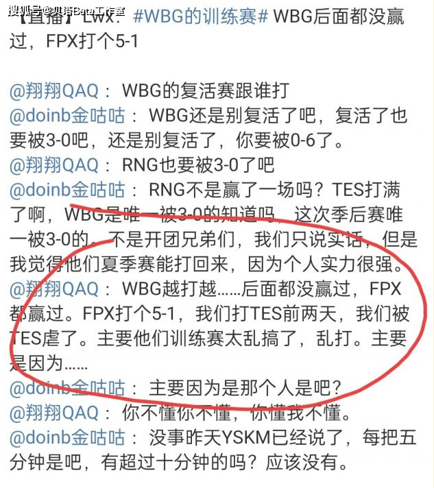 事情是这样的,lwx在WBG被淘汰后,去doinb直播间一起解说比赛,而在解说的过程中,谈到了WBG被淘汰这件事情,lwx爆料:WBG的训练赛太乱搞了,后面都没赢过,FPX训练赛打WBG都打了个5-1,就是乱打。而doinb则会赢:主要是因为那个人吧?每把五分钟是吧?有超过十分钟的训练赛吗?没有吧。