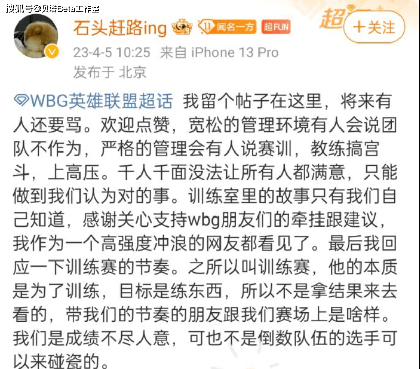 就是这番话引发了WBG老板的不满,在微博上公开发文,先是解释了训练赛的情况,表示:训练赛的本质是为了训练,为了练东西,所以结果不重要。接着阴阳怪气怒斥:我们是成绩不好,但也不是倒数战队的选手可以来碰瓷的。