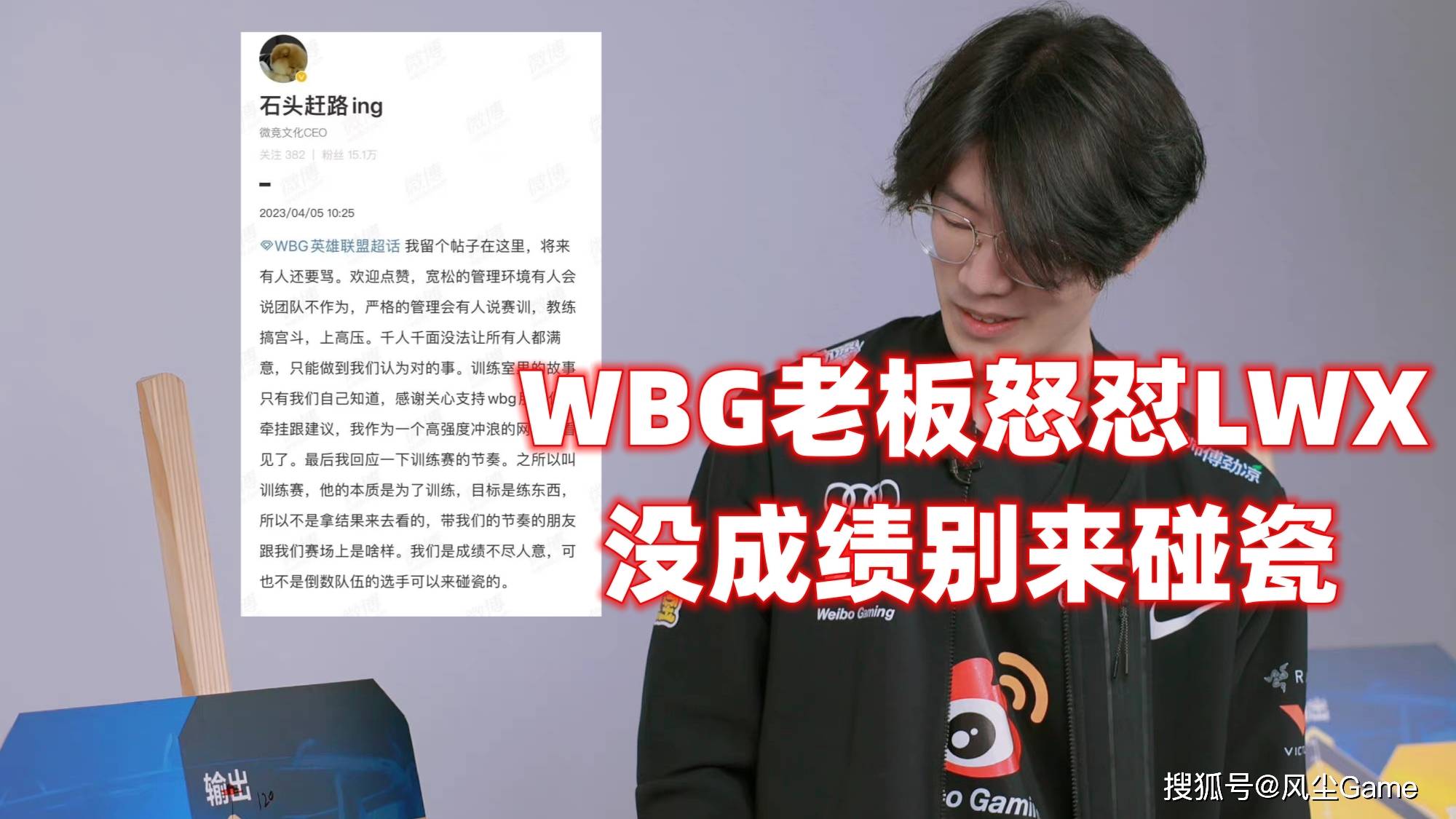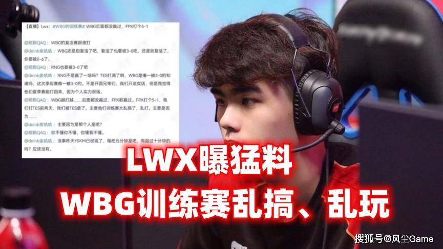 因为爆料了WBG训练赛相关的内容,LWX也是惹怒了WBG的老板,石头在战队超话发文回应了训练赛的问题:之所以叫训练赛,本质就是为了训练,目标是练东西,所以不是拿结果来去看的,带我们节奏的朋友跟我们赛场上是啥样,我们是成绩不尽人意,但也不是倒数队伍的选手可以来碰瓷的,虽然没有指名道姓,但目标直指LWX。