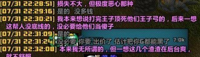 然后关键的转折来了,盗贼表示,如果要烂,那也要拍个视频亲自摧毁坐骑,否则谁知道坐骑是不是真的烂了,野人们纷纷表示赞同。这时团长说了一句:午夜你们不出价,那我正好就毛了它,不买算了。随后团长就不再说话,把坐骑收入自己囊中。此话一出,10人团队里,3名野人立即退队不打了,认为团长是个毛人。剩下的都和团长一个公会,是团长的“自己人”,基本就默认坐骑被团长毛了。从金团助手中也可以看到,午夜的炽热缰绳是没有任何出价和交易记录的。