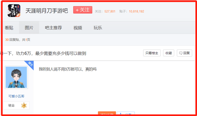 还是以《天刀》手游为例。有玩家发帖,想跟上大部队的战斗力,就得投入几万块钱。真的假的暂且放一边。主要是充钱买装备等于战力提升,这个概念是MMO玩家默认的事实。