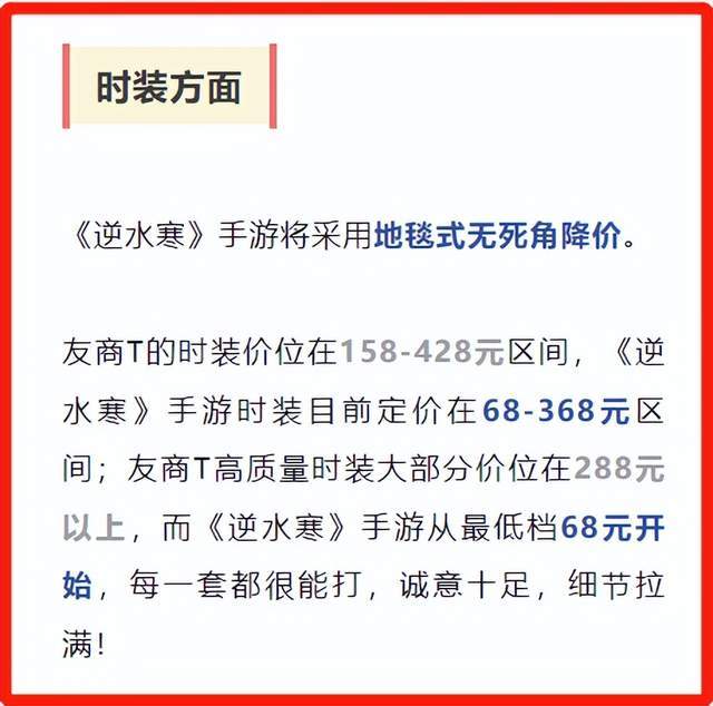 但是这样想就错了。《逆水寒》手游打价格战,不止降低时装开销,而是全部开销!