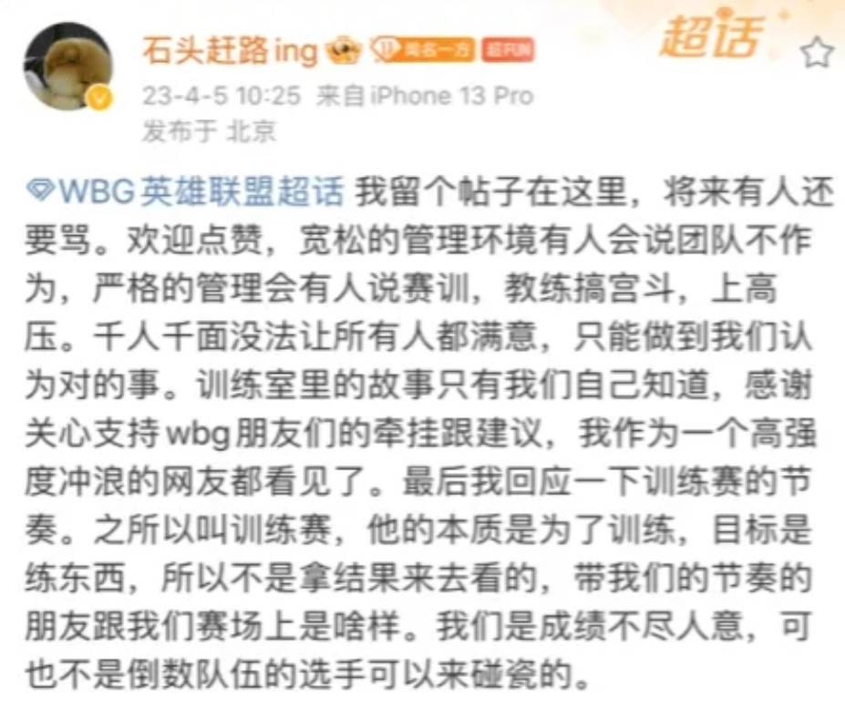 之后WBG经理还重点针对了一下Lwx,发布了微博,解释了一下训练赛,说训练赛结果不重要是为了练东西,最后补了一句:我们成绩差,但不是倒数队伍可以碰瓷的。