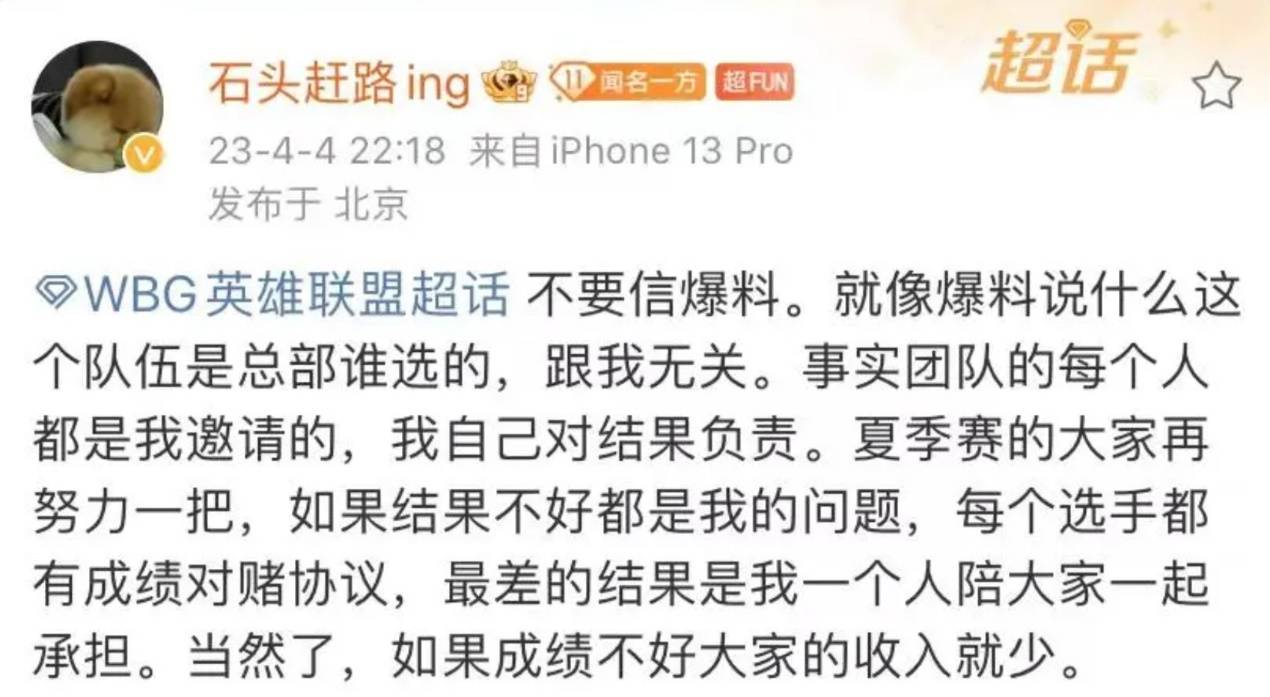 然后就轮到WBG经理的表演时刻,先是出面表示大家不要信爆料,团队每一个人都是他选的,然后选手都有对赌协议,打得不好他(经理)和选手一起承担,选手会减少收入的,然后下面表示教练组需要换了。