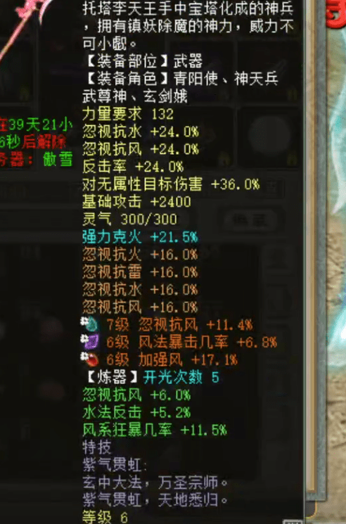 来看下武器,一件六级的神兵,还好不是六阶仙器,蓝字强力克火21.5;炼器属性忽视抗风6,风系狂暴11.5,目测这样一件武器,保守估计的话要过万了,甚至要比四阶仙器的价格高一些,毕竟四阶仙器的强风法属性还是比较少。选这样一件武器,用起来还是很不错的。