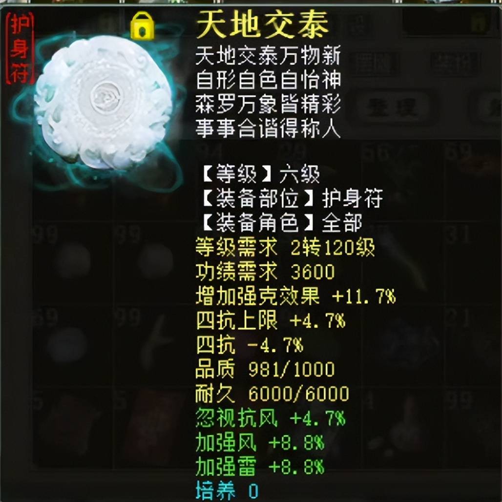 再来看下护身符,2转140级,佩戴了6级的护身符,虽然等级需求是允许的,不过3600点功绩,可能不怎么好弄,大家如果配号的话,克炮尽量选择底子带强克效果的,炼化的绿字带忽视+强法的,不过在炼化属性中,有忽视抗仙法+加强仙法,这个属性不建议用,这属性的数值要比单忽视+强法属性低一些。