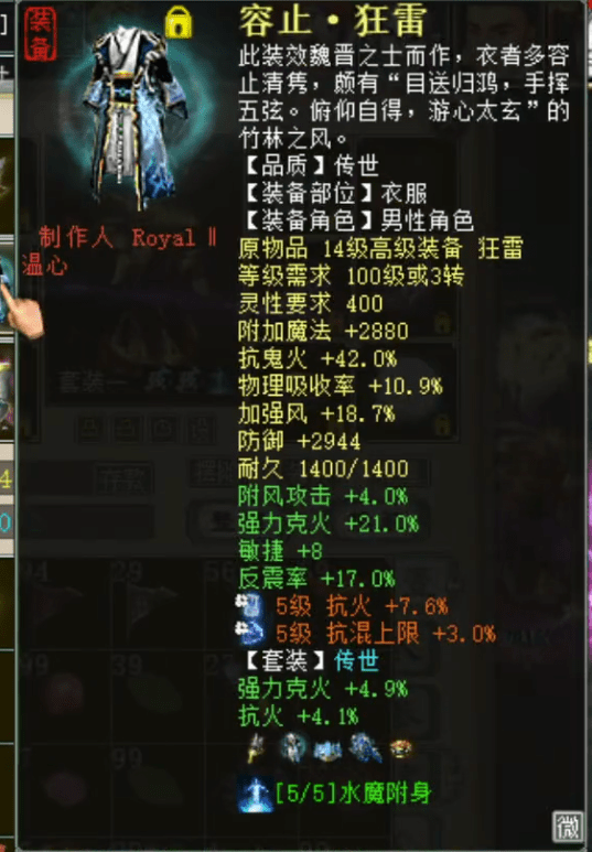 再来看下衣服,因为等级的限制,所以这仙只能用一件14级的高级装备,不过这高装的属性还是很靠谱的,强风18.7的底子,炼化强力克火21。