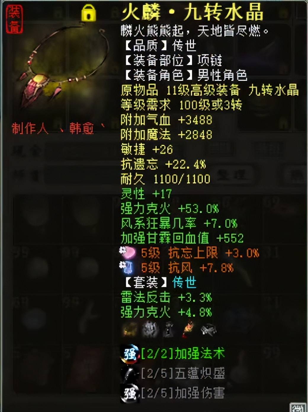 项链底子敏捷抗遗忘,炼化灵性17、克火53、风系狂暴几率7,项链的话,每个服务器应该有那么一两件相似的存货,大家在选择项链的时候,可以做个参考。