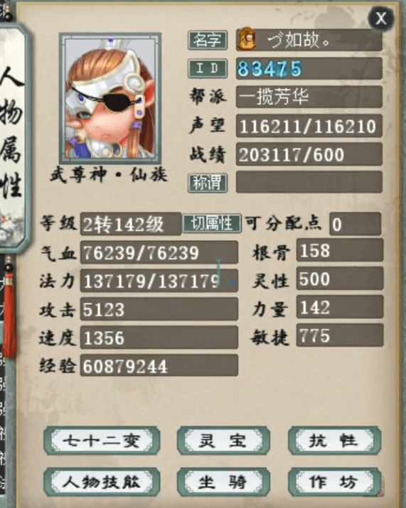 说到卡二转,之前有聊到过2转的仙器男人,还有聊到一些老铁打造的2转平民号,这个二转的男仙,相对来说有些小豪横,想要追求体验感的可以做个参考,见过一些卡等级142的仙族,灵性基本上卡着400分配点数的,这个仙却分配了500点,可能有老铁会好奇为什么这样分配,其实仙族一个灵爆效果,触发后加成伤害,所以在不影响速度的情况下,加500点灵性,大概考虑到了灵爆。