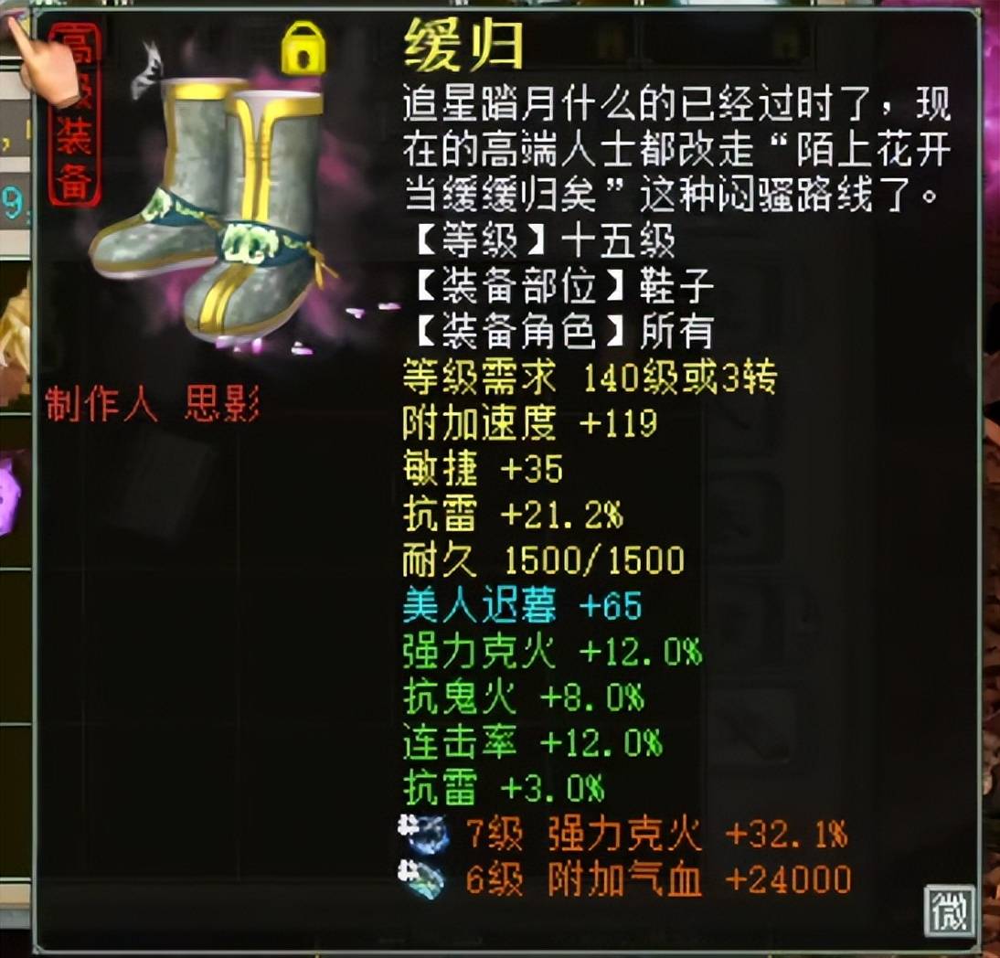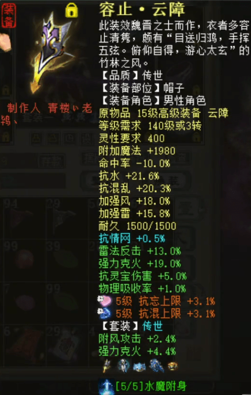 帽子用了一件15级的高装,强风法18,强力克火19,这装备比较好找,大家需要的话去集市、阁子转转能找得到,属性不是特别罕见,没有到一帽难求的地步。