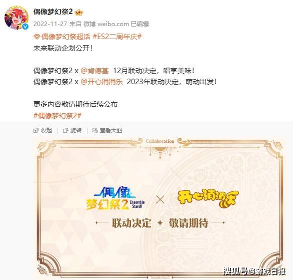 这次要说的主角是《开心消消乐》和《偶像梦幻祭2》。最近,双方正式放出了联动宣传物料和活动内容,吸引了一众玩家的目光。然而《偶像梦幻祭2》早在去年11月就官宣了和国民级消除游戏《开心消消乐》的联动计划,这波直接提前四个月官宣联动,直接给了玩家们一个定心丸。而且《开心消消乐》的用户年龄那是上至阿姨下到少女都有,主打的就是一个老幼咸宜,加上《偶像梦幻祭2》的年轻群体比较多,这联动一出,玩家直呼“我和我妈联动了”、“我和妈妈抢手机”!