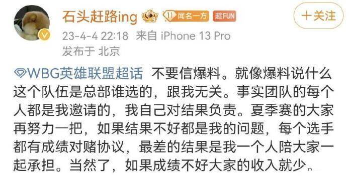 WBG的老板给粉丝们一个交代,直言下赛季会换教练组,并且和选手也已经签约了对赌合同,只要没有拿到好成绩就没有多少工资,以此来刺激选手努力训练和改变,希望他们夏季赛能拿到好成绩吧,对此你们有什么想说的吗?